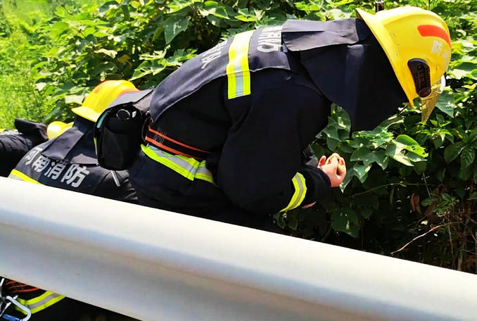 由于隔離護(hù)欄外散落很多的小雞崽,為了幫當(dāng)事人挽回?fù)p失,在做好現(xiàn)場(chǎng)警戒的同時(shí),消防員開(kāi)始對(duì)散落的小雞崽進(jìn)行“抓捕”。