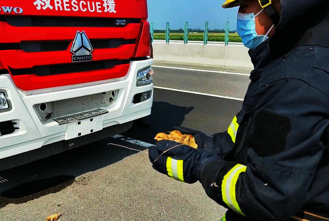 河南禹州:鄭欒高速一輛面包車(chē)起火 消防員滅火后幫雞崽“回家”