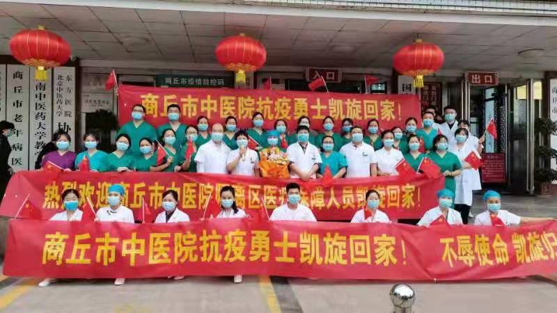 中新河南網商丘9月5日電(刁玉磊)9月3日下午,隨著商丘市封閉、封控區(qū)域的全部解除,商丘市中醫(yī)院39名隔離區(qū)醫(yī)療保障人員圓滿完成任務勝利凱旋。商丘市中醫(yī)院院長李德懷、副院長張士蘭、副院長張柏華、副院長郭玉鋒、副院長彭春峰、工會主席王冬梅及醫(yī)院職能科室負責人等在門口等候迎接。