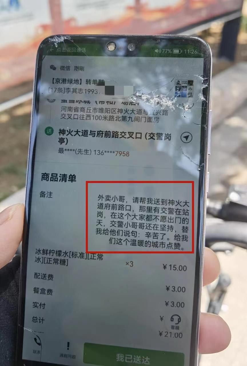 中新河南網(wǎng)商丘6月21日電 (許永強(qiáng) 通訊員 王豪杰)“外賣小哥,請(qǐng)幫我送到神火大道與府前路口,那里有交警在站崗,在這個(gè)大家都不愿出門的天,交警小哥哥還在堅(jiān)持,替我給他們說句辛苦了,給我們這個(gè)溫暖的城市點(diǎn)贊。”6月20日,正在商丘市委崗執(zhí)勤交警張向陽收到了外賣小哥送來的一份匿名涼飲。讓張向陽及同事們感到很驚訝,在炎炎夏季,他們也感受到了熱心市民送來的清涼。