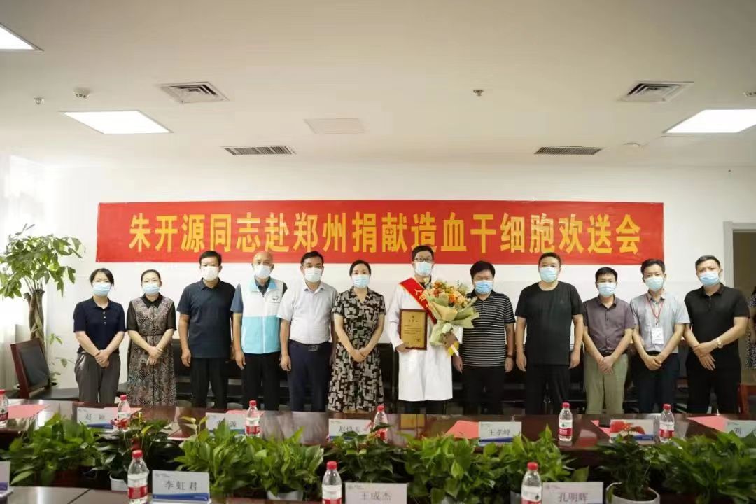 中新河南網(wǎng)商丘8月8日電(刁玉磊)8月4日下午,商丘市第三人民醫(yī)院神經(jīng)內(nèi)科醫(yī)生朱開(kāi)源赴河南省人民醫(yī)院捐獻(xiàn)造血干細(xì)胞歡送儀式在該院黨委會(huì)議室舉行。商丘市紅十字會(huì)監(jiān)事長(zhǎng)李虹君,商丘市紅十字會(huì)組宣部長(zhǎng)孔明輝,中國(guó)紅十字會(huì)捐獻(xiàn)造血干細(xì)胞志愿者服務(wù)總隊(duì)、中國(guó)紅十字會(huì)無(wú)償獻(xiàn)血志愿者服務(wù)總隊(duì)副秘書(shū)長(zhǎng)、河南省捐獻(xiàn)造血干細(xì)胞志愿服務(wù)大隊(duì)長(zhǎng)黃偉,梁園區(qū)政府辦公室副主任王成杰,梁園區(qū)紅十字會(huì)副科級(jí)干部焦春雷,梁園區(qū)衛(wèi)健委黨組書(shū)記、主任、市三院黨委書(shū)記趙修玉,黨委副書(shū)記、院長(zhǎng)王孝峰及醫(yī)院班子成員、科室主任、護(hù)士長(zhǎng)、支部書(shū)記、職工代表和新聞媒體朋友共20余人參加了當(dāng)天的歡送會(huì)。歡送儀式由院長(zhǎng)王孝峰主持。
