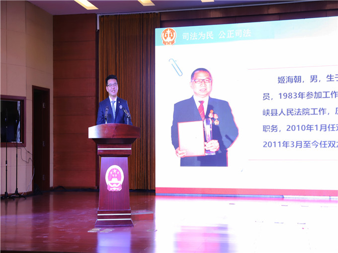 活動(dòng)中,播放了以姬海朝事跡為原型改編的微電影《蜂箱上壘起的審判席》,來自河南龍城律師事務(wù)所的柏文曉律師以《一個(gè)令人尊敬的好法官》為題,用樸實(shí)生動(dòng)的語言講述了他眼中的姬海朝法官。姬海朝同志扎根基層法庭十余年,堅(jiān)持“寧讓法官多走路,不讓百姓多跑腿”的為民理念,創(chuàng)新“車載法庭”巡回審判模式,方便群眾訴訟,減輕群眾負(fù)擔(dān)。時(shí)刻牢記“群眾利益無小事,民事糾紛無大小”,充分考慮當(dāng)事人實(shí)際困難,溫情辦案,耐心調(diào)解,盡最大努力維護(hù)當(dāng)事人合法權(quán)益。雖因工作遭遇意外身受重傷,仍選擇堅(jiān)守法庭,以對(duì)人民群眾的滿腔熱忱和對(duì)工作的高度責(zé)任心踐行著司法為民的初心使命。