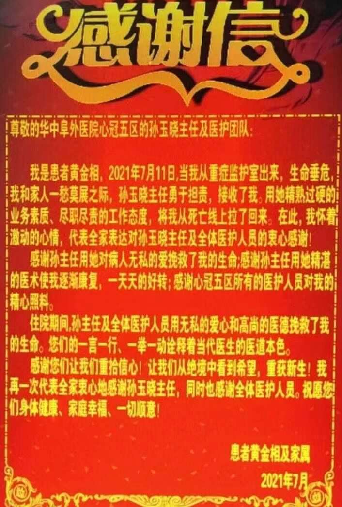 圖為危重患者黃金相及家屬出院時送來的感謝信