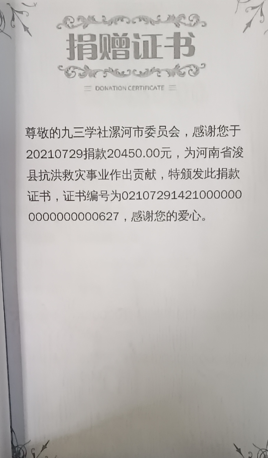 2021年7月29日,通過鶴壁市?h財政局賬戶捐款20450元。
