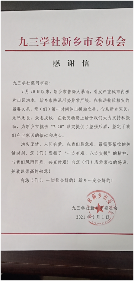 接收到捐贈物資及現(xiàn)金后,九三學(xué)社新鄉(xiāng)市委、鶴壁市防汛抗旱指揮部先后發(fā)來感謝信,感謝九三漯河市委對災(zāi)區(qū)的愛心捐贈和大力支持。