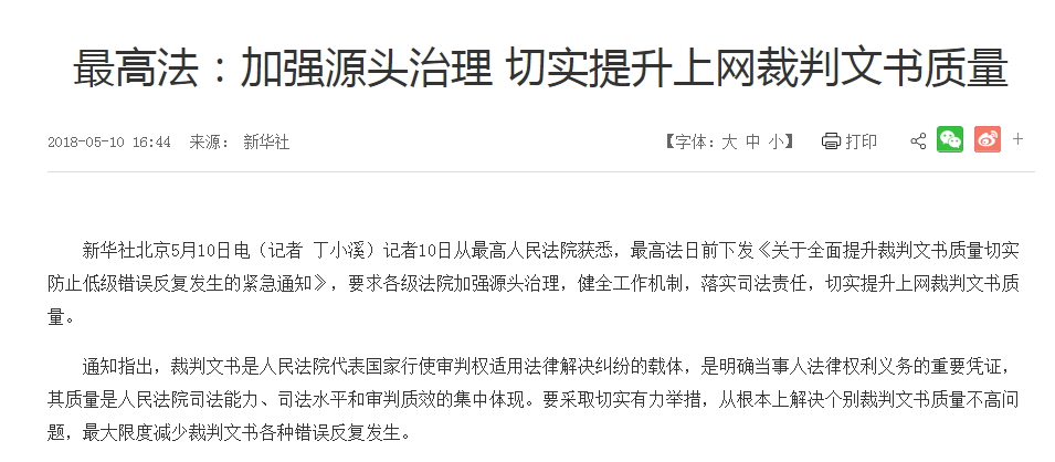紅星新聞記者了解到,2018年,最高法曾下發(fā)《關于全面提升裁判文書質(zhì)量切實防止低級錯誤反復發(fā)生的緊急通知》,要求各級法院加強源頭治理,健全工作機制,落實司法責任,切實提升上網(wǎng)裁判文書質(zhì)量。