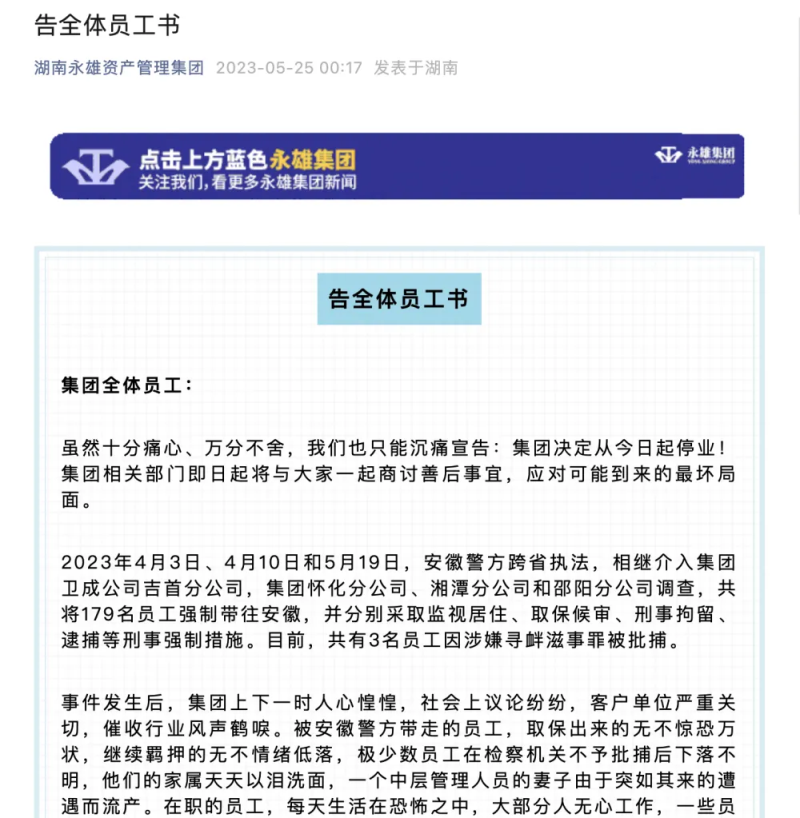 中新河南網(wǎng)5月26日電(任錢坤)5月25日凌晨,全國催收巨頭、總部位于湖南長沙的湖南永雄資產(chǎn)管理集團(tuán)有限公司(下稱“永雄集團(tuán)”)宣布從即日起停業(yè)。并在官微發(fā)布《告全體員工書》,表示集團(tuán)相關(guān)部門將商討善后事宜,應(yīng)對可能到來的最壞局面。