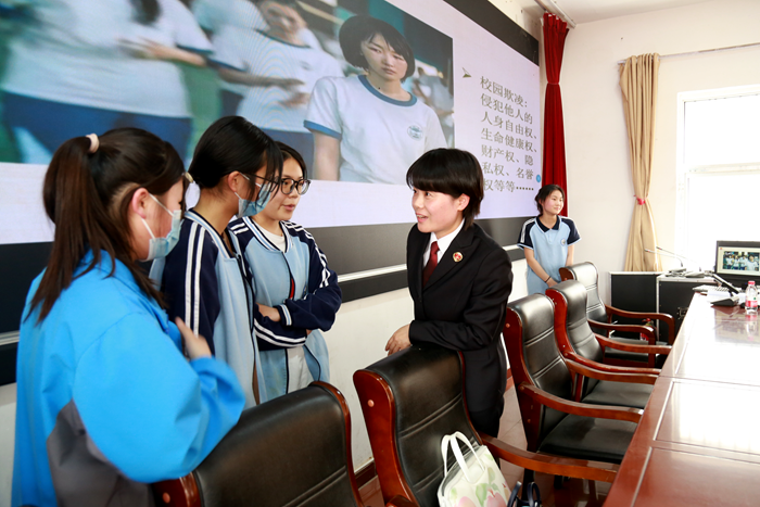 介紹完國家安全有關(guān)知識,韓輝結(jié)合典型案例,向?qū)W生講解法律關(guān)于未成年人犯罪刑事責任年齡的規(guī)定,常見的未成年人犯罪罪名、犯罪原因及預防措施。重點講述了校園欺凌、危害及處置辦法,鼓勵學生勇敢、機智應對,保護自己的合法權(quán)益等。講解過程中,為了加深同學們印象,她用虛擬案例故事《內(nèi)戰(zhàn):聚眾和斗毆》闡釋法律術(shù)語,讓學生扮演角色、情景模擬進行情感體驗,一個多小時的講授高潮迭起。