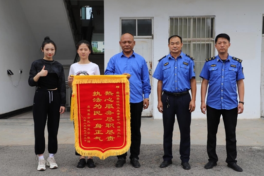 虞城縣市民(左一、左二)將一面錦旗贈送給城管隊員(著制服者)賈震攝