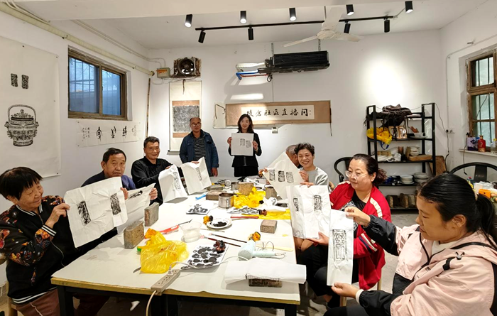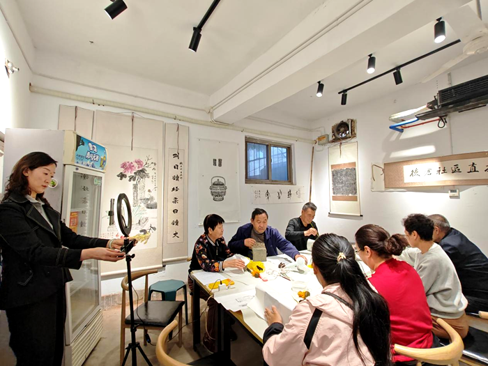 近日,后倉街社區(qū)為了更好的利用直播間優(yōu)化商戶服務(wù),來到倉巷街商戶佳泉文化工作室,和商戶負責人蘇偉老師共同分享后倉街社區(qū)直播間。該商戶是中國傳統(tǒng)技藝拓片傳習所。社區(qū)邀請轄區(qū)居民文化愛好者和我們一起,到直播間免費學習拓片的制作過程。工作室古色古香,墻上掛滿了各種拓片作品,充滿了濃厚的文化氣息。通過后倉街社區(qū)直播間,線上線下同時互動,學習拓片的來歷、制作方法及意義。轄區(qū)居民王有才現(xiàn)場談了自己的學習感受,不僅增長了見識,開闊了眼界,同時弘揚了中國傳統(tǒng)文化技藝,對佳泉文化工作室有了更新更深的了解認識。