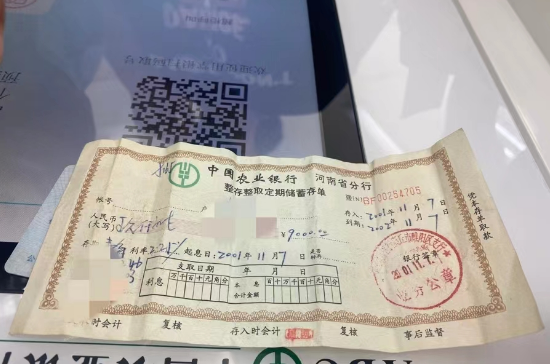 近日,該行一開(kāi)門就迎來(lái)一位戴著草帽的老先生,網(wǎng)點(diǎn)大堂客服經(jīng)理馬欣熱情地接待了他,詢問(wèn)老先生辦理什么業(yè)務(wù),老先生顫顫巍巍的從布袋里掏出一張陳舊微黃的紙張,接過(guò)來(lái)一看,是一張2001年手寫的定期儲(chǔ)蓄存單(正常支取需查閱歷史檔案資料,且身份證信息保持一致),于是趕緊把內(nèi)勤行長(zhǎng)祁苗苗喊出來(lái)詢問(wèn)怎么辦理。