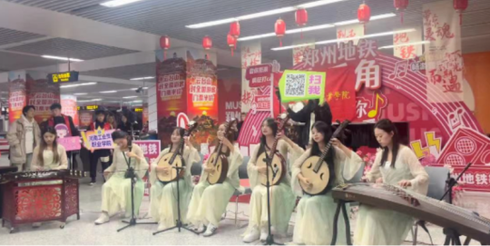 11月18日下午4時(shí),一場匯集了《聲聲慢》《煙雨行舟》《赤伶》等優(yōu)秀作品,融合了歌唱、器樂、舞蹈等元素的“快閃”活動(dòng)在人流如織的紫荊山地鐵站音樂角精彩上演。非洲鼓、小提琴、古箏、中阮等多種樂器獨(dú)特的音色,加之娓娓動(dòng)聽的演唱及輕盈優(yōu)美的舞姿,不僅凸顯了工貿(mào)學(xué)子扎實(shí)的功底,更加展現(xiàn)了青春亮麗的色彩,吸引了眾多過路群眾駐足觀看。在地鐵的轉(zhuǎn)角與高雅藝術(shù)撞個(gè)“滿懷”,這場不期而遇的邂逅,令所有大飽耳福的市民從驚喜到感動(dòng),從傾聽到合唱,從觀看到律動(dòng),表演者與市民共同感受音樂帶來的歡樂。