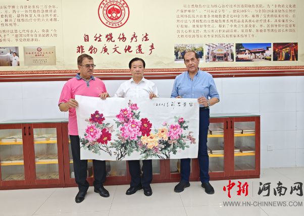 肖建勛教授指出:“此次交流是踐行‘中醫(yī)藥走出去’戰(zhàn)略的重要一步。埃及作為非洲和中東樞紐,將成為中醫(yī)藥國際化的重要支點(diǎn)。”肖建勛教授向來賓贈送了其專著《大圣手》及洛陽牡丹畫。