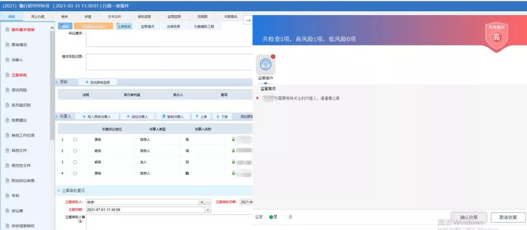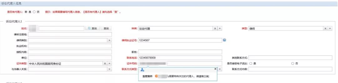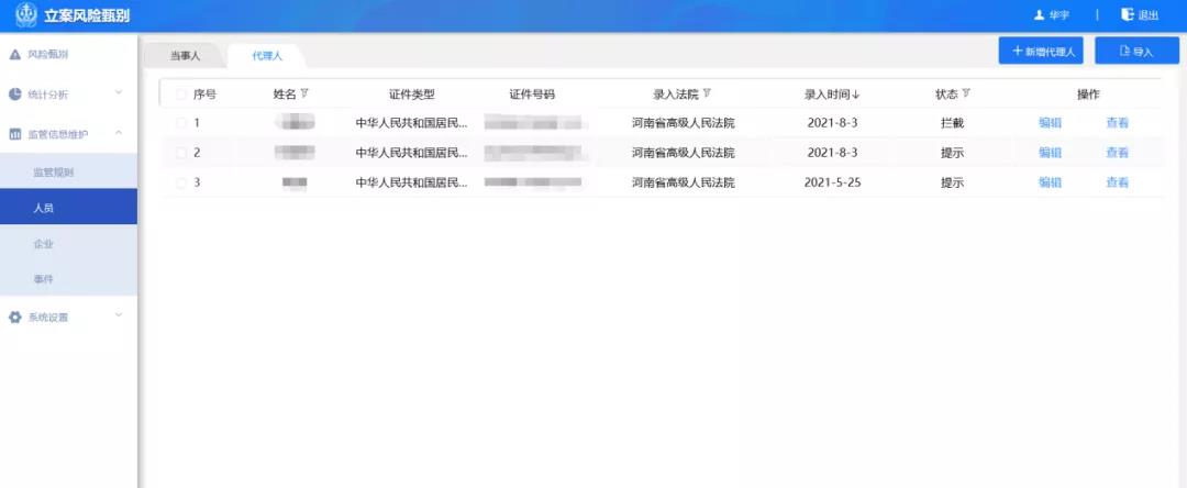 當(dāng)各級法院立案部門工作人員在錄入案件代理人、辯護人等基本信息時,系統(tǒng)會進行立案風(fēng)險篩查,一旦發(fā)現(xiàn)案件代理人、辯護人為法院離職人員時,自動進行信息比對,對違規(guī)代理本院案件或違反禁業(yè)限制規(guī)定代理案件的人員,直接進行攔截操作;在案件辦理過程中,變更代理人、辯護人等基本信息時,系統(tǒng)會提醒法官該案件存在違規(guī)代理風(fēng)險,應(yīng)及時告知當(dāng)事人更換訴訟代理人或辯護人,強化法院離職人員從業(yè)限制期內(nèi)監(jiān)督管理。