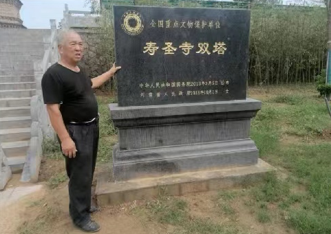 是他,一個地地道道的冉家村村民冉剛敏主動站出來,承擔起了對壽圣寺雙塔的保護任務(wù)。今年已經(jīng)年近古稀的冉剛敏,當年已經(jīng)年近半百,種過地,經(jīng)過商,在城市里做過農(nóng)民工。常言說:外邊的世界很精彩,外邊的世界很無奈,經(jīng)過一陣陣的人生沉浮,使他認識到,自己有責任,也有義務(wù)對家鄉(xiāng)做一點有益的善事。他看到盡管壽圣寺雙塔在當?shù)孛麣夂艽,每年還有古廟會演繹,但是,由于壽圣寺雙塔疏于管理,已經(jīng)到了瀕臨倒塌的邊沿,于是,在2002年他主動來到雙塔崗上,承擔起了對雙塔義務(wù)保護的工作。
