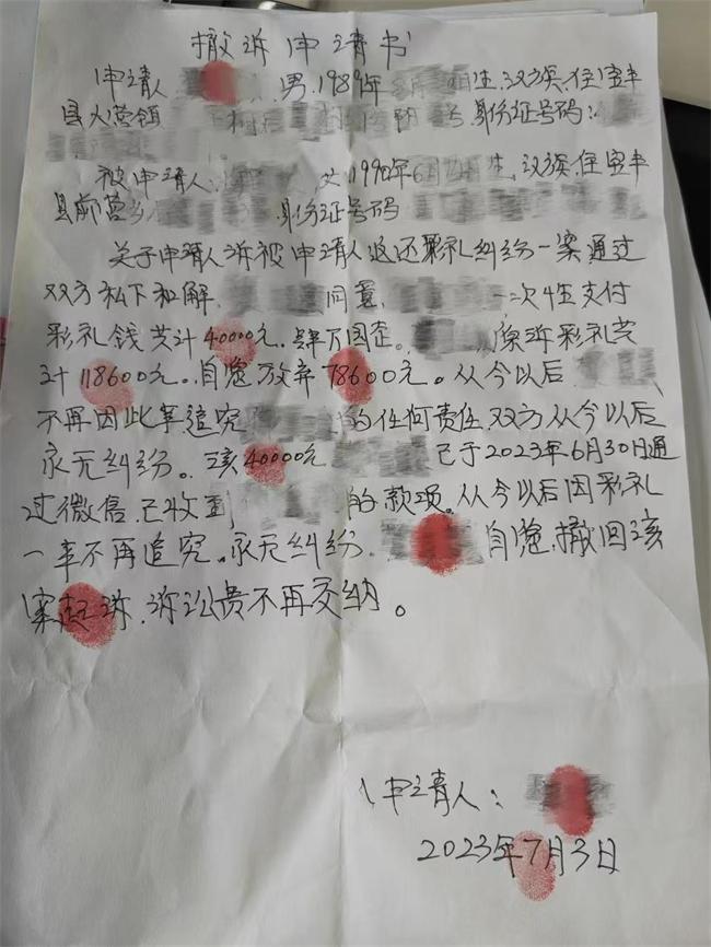 案件受理后,承辦法官與雙方幾番溝通,確認(rèn)二人感情破裂、無和好可能情形后,從雙方交往情況、共同生活時間、來往轉(zhuǎn)賬明細(xì)、本地風(fēng)俗習(xí)慣等方面綜合考量,向雙方釋法明理,充分講解民法典相關(guān)規(guī)定,促使雙方就返還彩禮數(shù)額達(dá)成一致。最終,被告王某向原告孫某返還彩禮款40000元、退還“三金”首飾,原告孫某申請撤訴,兩家矛盾就此化解。