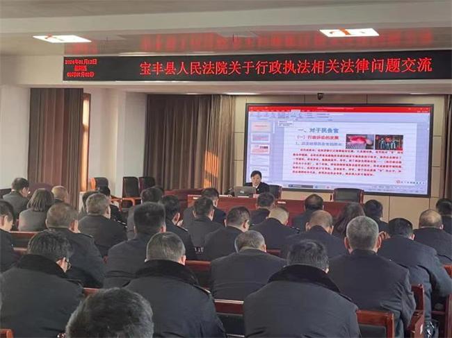 中新河南網(wǎng)(王萌)2024年伊始,萬(wàn)象更新,寶豐縣人民法院開(kāi)年就有“新氣象”,府院聯(lián)動(dòng)工作新年開(kāi)新局。為進(jìn)一步提升行政機(jī)關(guān)執(zhí)法人員的職業(yè)素養(yǎng)和專業(yè)能力,1月12日上午,寶豐法院行政綜合庭庭長(zhǎng)李應(yīng)敏應(yīng)邀到寶豐縣交通運(yùn)輸局開(kāi)展“依法提升行政執(zhí)法質(zhì)效”培訓(xùn),縣交通局80余名執(zhí)法人員參加培訓(xùn)。