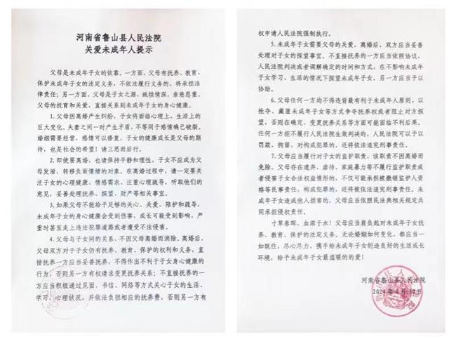 這是自4月15日最高人民法院發(fā)布《關(guān)于在涉及未成年子女的離婚案件中開展“關(guān)愛未成年人提示”工作的意見》后,魯山縣法院發(fā)出的首份《關(guān)愛未成年人提示》,著重保護(hù)未成年人合法權(quán)益,將關(guān)愛未成年人精神貫徹落實(shí)到案件辦理中。