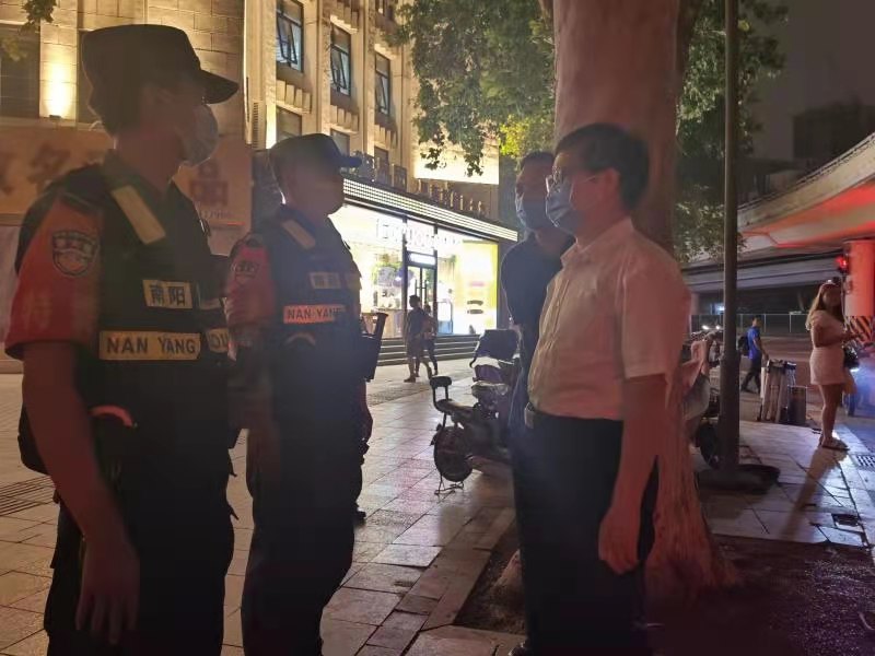 在金水路與花園路交叉口,正在這里巡邏執(zhí)勤的省公安廳“青年突擊隊(duì)”和從其他地市調(diào)配的巡特警,個個精神飽滿、斗志昂揚(yáng)。顧雪飛親切地同大家一一握手,詢問執(zhí)勤工作情況,了解當(dāng)前執(zhí)勤工作中的實(shí)際困難。當(dāng)了解到馳援鄭州的南陽巡特警還未吃晚飯時,顧雪飛當(dāng)即責(zé)成有關(guān)部門立即現(xiàn)場對接,讓執(zhí)勤民警盡快吃上飯,切實(shí)做好相關(guān)警務(wù)保障工作。顧雪飛指出,防汛救災(zāi)工作是一場硬仗,廣大民警要保持“越是艱險(xiǎn)越向前”的英雄氣概,以堅(jiān)強(qiáng)的意志、堅(jiān)定的決心、頑強(qiáng)的作風(fēng),堅(jiān)決奪取防汛救災(zāi)的最后勝利,并叮囑大家嚴(yán)格規(guī)范文明執(zhí)勤,全力守護(hù)省會百姓安全,也要切實(shí)做好自身安全防護(hù)。