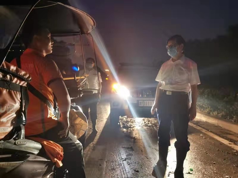 夜幕下,一個個的十字路口,疏導(dǎo)交通的交警忙碌工作著,車來車往、城市多數(shù)主干道通行有序。顧雪飛不時駐足與過路群眾、出租車司機(jī)、外賣小哥、執(zhí)勤交警等交流,認(rèn)真聽取大家對災(zāi)后恢復(fù)交通暢通的意見建議。顧雪飛強(qiáng)調(diào),公安交警部門要在黨委、政府領(lǐng)導(dǎo)下,積極配合有關(guān)部門,對損毀路面、積水路段、橋涵,以及阻擋道路通行的車輛、樹木等障礙物,抓緊進(jìn)行維修、排水、清理,盡最大努力盡快恢復(fù)城市主干道暢通。要及時發(fā)布道路通行信息,加強(qiáng)群眾出行引導(dǎo),加強(qiáng)險(xiǎn)要路段的應(yīng)急值守,切實(shí)保障道路交通安全。