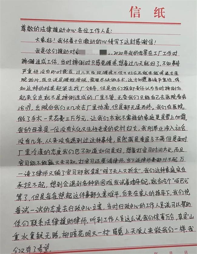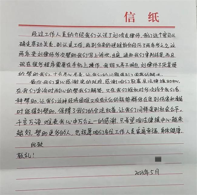近日,獲嘉縣法律援助中心收到了來(lái)自受援人王女士的手寫信,信里字跡工整,字里行間透露著對(duì)法律援助律師最真摯的感謝。
