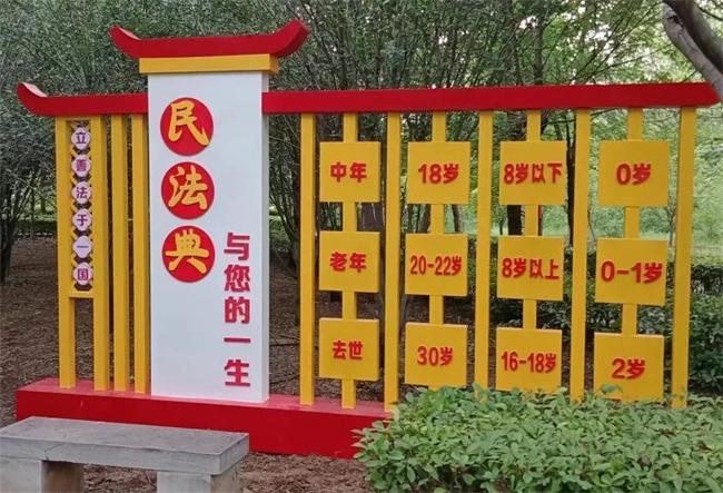 沿邊道路兩側(cè)重點(diǎn)宣傳法治格言以及名人故事等,風(fēng)格統(tǒng)一的法治標(biāo)識(shí)牌和環(huán)環(huán)相扣的法治拱形門讓人眼前一亮。在“憲法宣傳欄”專區(qū),設(shè)置了“12·4”憲法宣傳欄,“弘揚(yáng)憲法精神推動(dòng)憲法實(shí)施”,讓居民更加直觀地感受憲法,知“憲”于心,學(xué)“法”于行。在“民法典宣傳欄”專區(qū),設(shè)置了“法治謎語”、“趣味法治翻翻牌”等寓教于樂平臺(tái),充分展示作為新中國第一部以法典命名的法律,被稱為“社會(huì)生活的百科全書”的法治內(nèi)涵。在青少年普法專區(qū),設(shè)置了各種造型的趣味漫畫,青少年漫步其中,馬上進(jìn)入沉浸式學(xué)習(xí)法律知識(shí)模式,感受法治清風(fēng),思考法治意義,從而在心中種下尊法守法的法治信仰。在法治文化長(zhǎng)廊專區(qū),設(shè)置了諸多與群眾生活息息相關(guān)的法律條文,圖文并茂,讓群眾近距離感受法治文化。