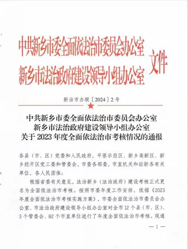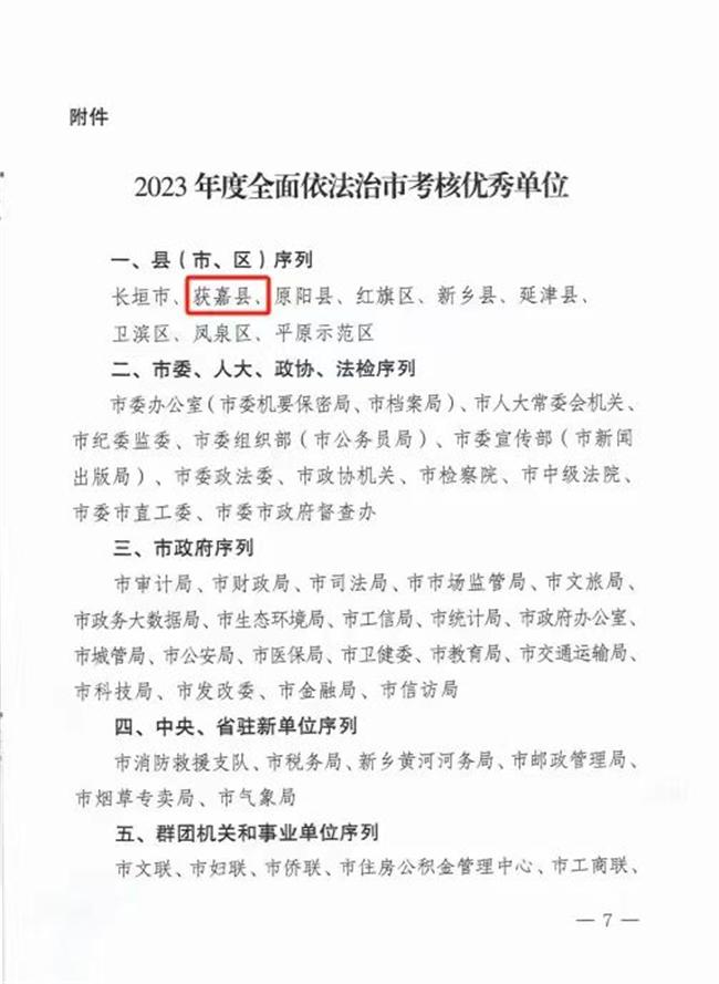 獲嘉縣榮獲2023年度全面依法治市考核優(yōu)秀等次