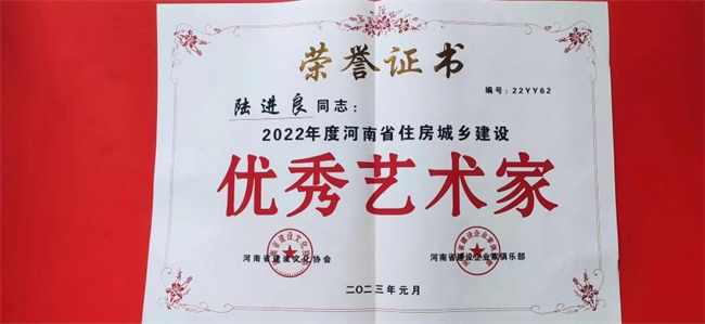 2023年2月3日,“雙擁劇場”燈光璀璨,河南省建設(shè)文化協(xié)會會長黃海將“優(yōu)秀藝術(shù)家”榮譽(yù)證書,頒發(fā)給陸進(jìn)良。與此同時,當(dāng)天其他受到表彰的人員,也被邀請上臺并合影留念。