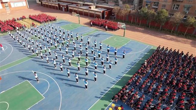 音樂響起,學生們精神抖擻、朝氣蓬勃,動作整齊劃一。揮臂,踢腿,彎腰,跳躍,用身體演出甲骨文字,一招一式都剛勁有力,舉手投足之間盡顯青春風采,讓古老的中華文字煥發(fā)出獨特的魅力。