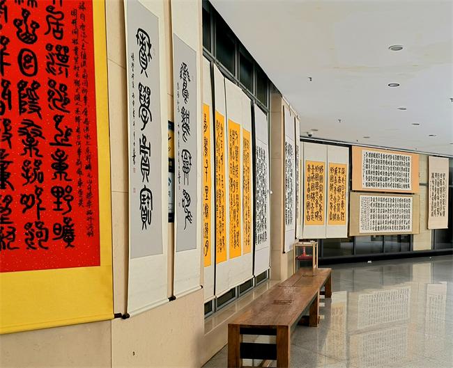 本次展出作品120件,有四尺、六尺、八尺作品毛澤東詩(shī)詞,唐詩(shī)宋詞,有少年中國(guó)說(shuō)等。其中有鳥(niǎo)蟲(chóng)篆三十米長(zhǎng)卷毛澤東詩(shī)詞,有行書(shū)臨寫(xiě)唐伯虎《落花詩(shī)冊(cè)》50米長(zhǎng)卷,有臨寫(xiě)趙孟頫行書(shū)20米長(zhǎng)卷,有臨寫(xiě)王羲之行書(shū)15米長(zhǎng)卷。