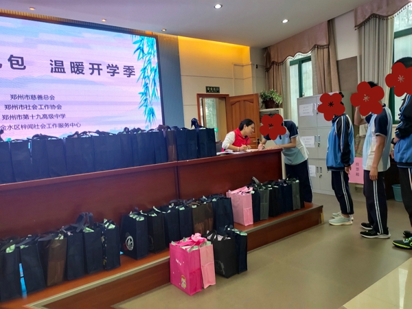 中新河南網(wǎng)9月29日電(通訊員王紅芳)在經(jīng)歷了7月洪災(zāi),8月疫情之后,鄭州各中小學(xué)終于在9月中下旬迎來(lái)了開(kāi)學(xué)。為了關(guān)愛(ài)困境學(xué)生,鄭州市慈善總會(huì)聯(lián)合鄭州市社會(huì)工作協(xié)會(huì),攜手鄭州市金水區(qū)梓聞社會(huì)工作服務(wù)中心學(xué)校社工服務(wù)項(xiàng)目,為鄭州市第十九高級(jí)中學(xué)困境學(xué)生送來(lái)了助學(xué)大禮包,溫暖了他們的開(kāi)學(xué)之路。