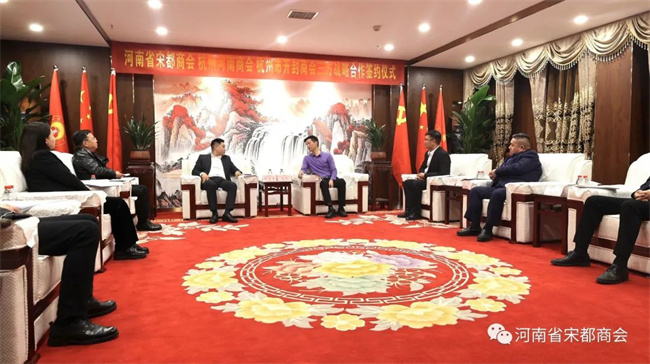 中新河南網(wǎng)4月8日電 酣春四月,春暖花開(kāi)。4月6日下午,河南省宋都商會(huì)與杭州河南商會(huì)、杭州市開(kāi)封商會(huì)在鄭州綠都廣場(chǎng)舉行三方戰(zhàn)略合作簽約儀式,旨在進(jìn)一步加強(qiáng)經(jīng)貿(mào)合作,增進(jìn)了解,資源共享,助力經(jīng)濟(jì)社會(huì)高質(zhì)量發(fā)展。河南省宋都商會(huì)主席張軍旗,副主席任佰偉、李陽(yáng);河南省宋都商會(huì)監(jiān)事長(zhǎng)劉亞鵬、辦公室主任王坤朋;杭州河南商會(huì)會(huì)長(zhǎng)、杭州市開(kāi)封商會(huì)榮譽(yù)會(huì)長(zhǎng)肖杰,杭州市開(kāi)封商會(huì)黨支部書(shū)記、杭州河南商會(huì)副會(huì)長(zhǎng)馬關(guān)印,杭州市開(kāi)封商會(huì)輪值會(huì)長(zhǎng)、杭州河南商會(huì)副會(huì)長(zhǎng)趙爽,杭州市開(kāi)封商會(huì)副會(huì)長(zhǎng)馬勝、杭州市開(kāi)封商會(huì)副會(huì)長(zhǎng)柴佳佳、杭州市開(kāi)封商會(huì)副秘書(shū)長(zhǎng)陳憲龍;浙江萱義公司董事長(zhǎng)張芝前、河南省京九智慧園林工程有限公司胡勁松;杭州市開(kāi)封商會(huì)秘書(shū)薛麗妍以及特邀嘉賓等二十余位商界精英人士出席會(huì)議。簽約儀式由河南省宋都商會(huì)副主席兼秘書(shū)長(zhǎng)任佰偉主持。