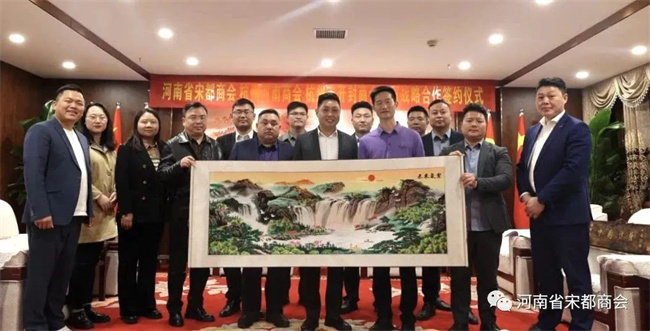 河南省宋都商會(huì)向杭州河南商會(huì)、杭州市開(kāi)封商會(huì)分別贈(zèng)送大型精美“紫氣東來(lái)”汴繡,并合影留念。(河南省宋都商會(huì)供稿)