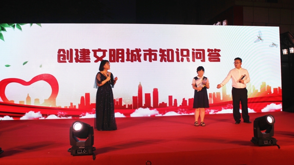 除了精彩紛呈的節(jié)目表演,活動穿插的黨史知識和創(chuàng)建文明城市有獎問答環(huán)節(jié)更是激起了現(xiàn)場觀眾極大的興趣,現(xiàn)場觀眾踴躍參與、氣氛熱烈。最后,紅歌連唱《唱支山歌給黨聽》《我和我的祖國》,用歌聲禮贊新中國,表達對祖國的熱愛與祝福,為整場演出畫上圓滿的句號。