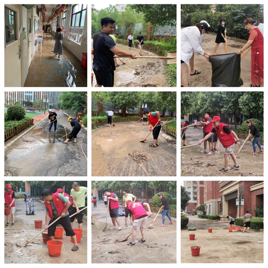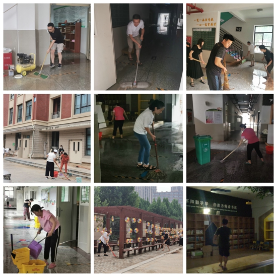 暴雨停歇,積水未退。眾多外小教師知道學(xué)校受災(zāi)之后,紛紛請(qǐng)戰(zhàn),大家克服困難、涉水逆行,奔赴學(xué)校,盡力所之能及,投入到美麗校園的恢復(fù)工作之中。21日至今,外小領(lǐng)導(dǎo)班子帶領(lǐng)志愿老師們清理被大雨沖塌的泥磚,整理被水浸泡的物品,消殺汛情過(guò)后的校園,排查下水管道是否堵塞、電路是否損壞,檢查地面是否有安全隱患,他們拿起鐵锨鏟泥沙,揮舞掃帚清積水。校園里停水?dāng)嚯姡顾敢律、淤泥濺到身上無(wú)法清洗,老師們雙手磨出了泡,卻無(wú)人叫苦、無(wú)人退卻。一幅幅感人的畫面,一個(gè)個(gè)泥濘的身影,踐行了外小人的初心使命。