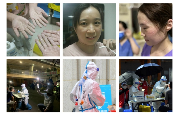 疫情當(dāng)前,群眾也紛紛用自己的方式自發(fā)地為防疫盡一份力。一把為醫(yī)護(hù)人員揮動(dòng)的搖扇;一輛市民自己改造的核酸檢測(cè)車(chē);核酸檢測(cè)點(diǎn)突然停電而舉起的點(diǎn)點(diǎn)星光;一群深夜排隊(duì)等待做核酸檢測(cè)的爺爺奶奶;居民為醫(yī)務(wù)人員自制的冰塊馬甲;醫(yī)務(wù)人員背后悄悄舉起的遮陽(yáng)傘……