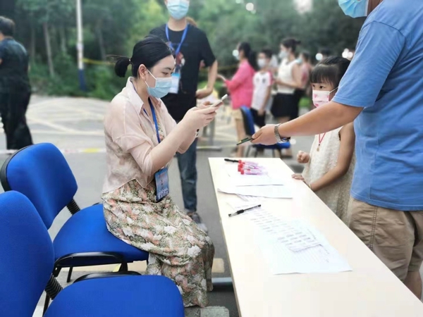 黨員教師張一第一時間參與到區(qū)教育局統(tǒng)一安排的黨員教師下沉社區(qū)參與疫情防控工作,一早就守候在檢測點展開工作,登記信息、維持秩序、協(xié)助未申領(lǐng)健康碼的人員申領(lǐng)等。