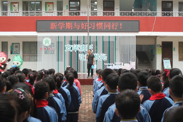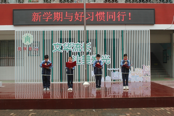 在主題升旗儀式上,該校大隊輔導(dǎo)員王曉杰向大家發(fā)出了倡議,他希望全體師生從新學(xué)期開始結(jié)合學(xué)校“與好習(xí)慣同行”養(yǎng)成教育課程綱要,從學(xué)生日常學(xué)習(xí)生活等各個方面開始規(guī)范學(xué)生的日常行為,結(jié)合學(xué)生的年齡特點共同制定不同的評價體系和標(biāo)準(zhǔn),使每個學(xué)生都能積極參與并從中收獲成長。