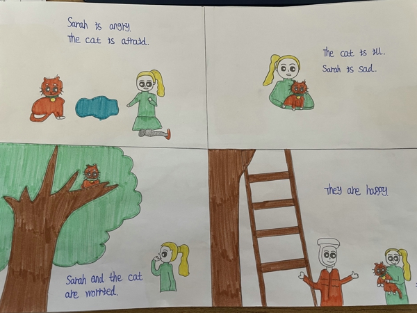 南關小學六年級的孩子們在學習完《Unit6Howdoyoufeel?》之后,開始探索英語故事中各個角色的內心世界。南關小學的英語老師適時對孩子們進行了特色作業(yè)設計——讓孩子們自己去設計英語學習資料,設計自己的英語“小繪本”。一時間,孩子們發(fā)散思維進行了“頭腦風暴”,孩子們覺得“feel”其實在各個場景中都有所體現,于是,依據課本上的六個單元話題,孩子們開始了自己的手繪英語連環(huán)畫之路。經過三天的設計與繪畫,孩子們的作品如約提交。我們看到,孩子們在繪畫的同時,更是充分應用了六年級上學期學習的諸多實用句型,編制成一個個生動地小故事為繪畫增光添彩,愉悅身心地同時又鞏固了英語專業(yè)知識。