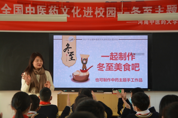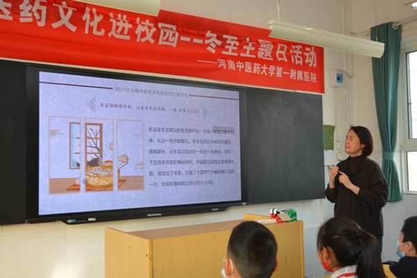 中新河南網(wǎng)12月22日電(通訊員侯倩倩)當(dāng)二十四節(jié)氣冬至遇上傳統(tǒng)中醫(yī)藥文化,又會(huì)碰撞出怎樣的火花?為進(jìn)一步引導(dǎo)學(xué)生追尋民族文化根源,2021年12月21日下午,鄭州市金水區(qū)工人第一新村小學(xué)聯(lián)合河南省中醫(yī)藥大學(xué)第一附屬醫(yī)院舉行“2021全國中醫(yī)藥文化進(jìn)校園——冬至主題日活動(dòng)”。