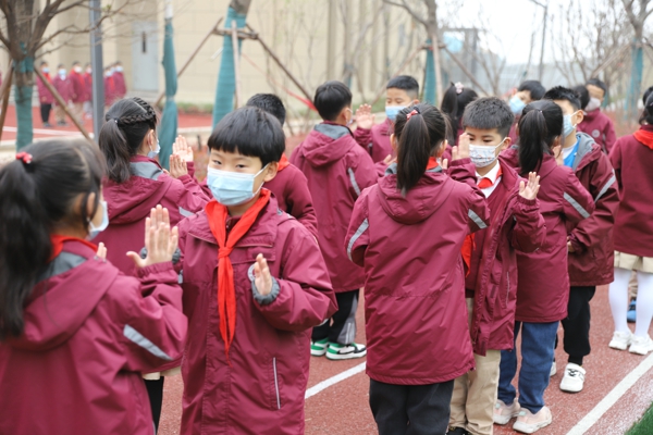 學(xué)生們身著校服,隊(duì)列整齊,神情莊重,高唱《義勇軍進(jìn)行曲》、《歌唱祖國(guó)》,以嘹亮的歌聲向祖國(guó)致以最真摯的祝福。接著,副校長(zhǎng)李莉娟為大家?guī)砹擞⑿畚⒄n程《聶耳的故事》,全體學(xué)生認(rèn)真聆聽,炙熱的眼神中透露出對(duì)聶耳的崇敬,熱愛祖國(guó)、紅心向黨的愛國(guó)主義精神在心中發(fā)芽成長(zhǎng)。接著,二一班同學(xué)用一首簡(jiǎn)單明快的《衛(wèi)生拍手歌》將文明衛(wèi)生口訣傳播進(jìn)校園,讓文明禮儀之花綻放在每一名學(xué)生的心里。各中隊(duì)也制定了豐富的文明愛衛(wèi)活動(dòng),在日后帶領(lǐng)學(xué)生將“樹文明新風(fēng),創(chuàng)衛(wèi)生校園”落實(shí)在行動(dòng)。