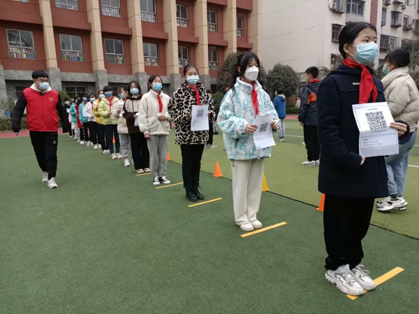21日上午8:50,大隊輔導(dǎo)員李翠老師統(tǒng)一調(diào)配,王瑩瑩、陸政兩位老師用心組織提醒,學(xué)生們自覺對照地面標(biāo)識,保持好一米間隔,全程佩戴好口罩,進(jìn)行核酸檢測,檢測完畢后學(xué)生有序回班。