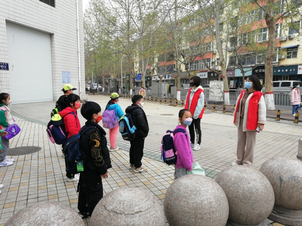 黨員、家長志愿者、巡防隊員在家長接送點為學生上放學安全保駕護航