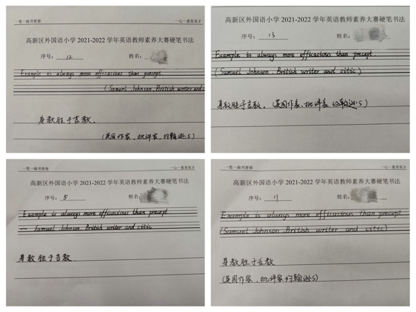 小學(xué)是學(xué)生學(xué)習(xí)成長的奠基階段,良好的書寫習(xí)慣離不開老師的示范引領(lǐng)。英語文本的規(guī)范書寫和正確翻譯,是英語教師的基本功。學(xué)科組采用現(xiàn)場抽簽、臨時書寫翻譯的形式,對英語組全體教師的基本功進(jìn)行了全面考查。工整、精美的作品體現(xiàn)出精湛的技藝。