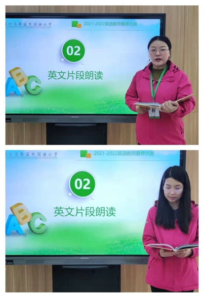 英語教師的口語朗讀是必備素養(yǎng),潛移默化中對學(xué)生的長足發(fā)展起著重要作用。依然是采用抽簽的形式,教師隨機(jī)上臺進(jìn)行課文朗讀,發(fā)音規(guī)則、朗讀技巧、臺風(fēng)面貌均全面體現(xiàn),學(xué)科組骨干教師進(jìn)行現(xiàn)場評價。