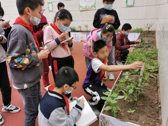 學(xué)生在老師的指導(dǎo)下觀察著前期種下的中草藥,紫蘇已經(jīng)發(fā)芽,芍藥、金銀花、向日葵抽枝長(zhǎng)葉,薄荷、香菜綠得發(fā)亮,棵棵藥草長(zhǎng)勢(shì)喜人。老師指導(dǎo)學(xué)生通過(guò)“望、聞、摸、量”的方式去觀察種植園中的一草一木。學(xué)生們積極參加,熱情高漲,通過(guò)細(xì)致觀察比較,發(fā)現(xiàn)了一些問(wèn)題,為什么同時(shí)種下的金銀花,長(zhǎng)得有的株上葉子多,有的葉子少;為什么同一位置的芍藥也是一高一矮、一胖一瘦。
