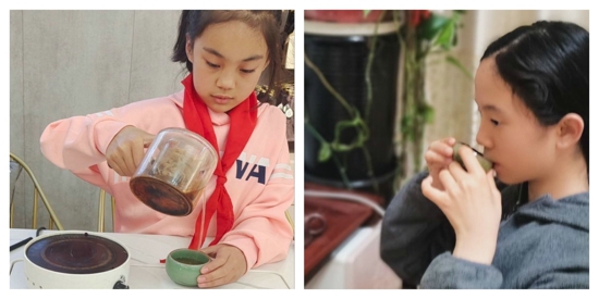 課下,“太陽花”們親手泡上一杯谷雨茶,約家人一起品悟中華悠久深厚的茶文化,一杯淳厚的香茗敬給長輩,以表自己的愛意和孝心,讓谷雨節(jié)氣攜著沁人心脾的茶香印在童年的記憶里。