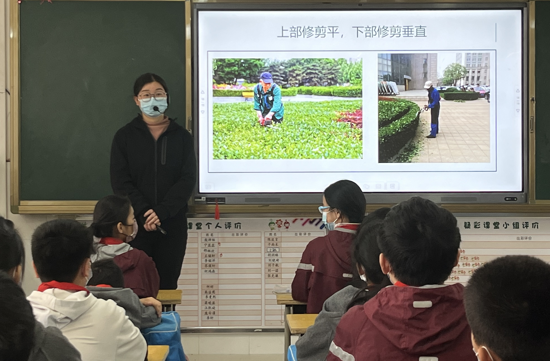 “谷雨”即“雨生百谷”之意,谷雨時(shí)節(jié),秧苗初插、作物新種,校園的綠植也愈發(fā)顯得生機(jī)勃勃。借此時(shí)節(jié),五六年級(jí)的班主任在隊(duì)會(huì)課上給“石榴果”們講解了植物養(yǎng)護(hù)與園藝修剪的知識(shí)。