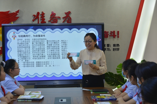 尋覓著遠處的讀書聲,走進一樓少年隊活動室。瞧,“跟著校長去讀書”閱讀欄目正在如火如荼的進行著。學(xué)校黨支部書記、校長孫冬梅正帶領(lǐng)少先隊員們暢游書海,探索科學(xué)的秘密。她還結(jié)合當(dāng)下時事,以神舟十三號飛船返回地球為出發(fā)點,引導(dǎo)孩子們暢談中國航天的發(fā)展歷程,幼小的心靈已悄然種下探索科學(xué)的種子,愛國主義情懷也在閱讀探索中不斷生發(fā)。交流分享會、撰寫讀書卡、自編自創(chuàng)閱讀三句半、贏得閱讀幣……孩子們享受著閱讀帶來的快樂。欄目開設(shè)以來,跟著校長去讀書已成為校園新風(fēng)尚,博學(xué)多才的校長媽媽成為了孩子們追尋的“星”。