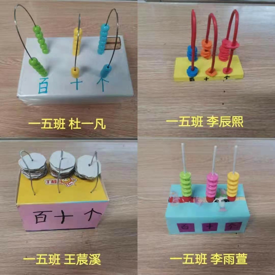 為了提高孩子的動(dòng)手能力,培養(yǎng)他們的創(chuàng)新思維,更好的讓孩子認(rèn)識(shí)100以?xún)?nèi)的數(shù),一年級(jí)數(shù)學(xué)組開(kāi)展了自制學(xué)具-----制作計(jì)數(shù)器的活動(dòng)。孩子們利用各種各樣的材料,變廢為寶,大膽設(shè)計(jì)。通過(guò)操作,學(xué)生初步理解個(gè)位、十位、百位的名稱(chēng)和順序。讓孩子動(dòng)手操作,在計(jì)數(shù)器上撥出珠子,知道這些數(shù)是由幾個(gè)十和幾個(gè)一組成的。并說(shuō)出同一個(gè)數(shù)在不同的數(shù)位上表示的意義。同時(shí)讓孩子讀出計(jì)數(shù)器上的數(shù),知道讀數(shù)和寫(xiě)數(shù)都是從高位起。孩子們?cè)谥谱髦畜w會(huì)快樂(lè),在快樂(lè)中收獲知識(shí),真正做到了玩中學(xué),樂(lè)中學(xué)。